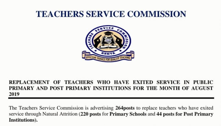 The Teachers Service Commission is advertising 264 posts to replace teachers who have exited service through Natural Attrition (220 posts for Primary Schools and 44 posts for Post Primary