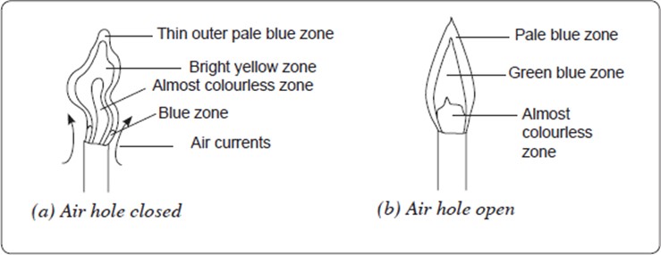 When the air hole is slowly opened, more air enters the chimney. The bright yellow colour of the luminous flame gradually changes. When the air hole is fully opened, more air enters the chimney and mixes with the laboratory gas. The mixture of gases burns more quickly and completely. The flame obtained is pale blue in colour and is described as a non-luminous flame because it does not give out much light.