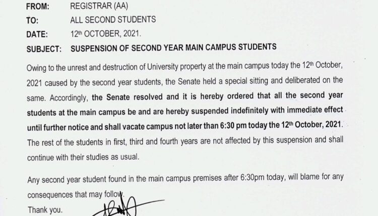 Owing to the unrest and destruction of University property at the main campus today the 12th October 2021 caused by the second-year students, the Senate had a special sitting and deliberated on the same. Accordingly, the Senate resolved and it is hereby ordered that all the second-year students at the main campus be and are hereby suspended indefinitely with immediate effect until further notice and shall vacate campus no later than 6:30 pm today the 12th October, 2021. The rest of the students in the first, third and fourth years are not affected by this suspension and shall continue with their studies as usual.
