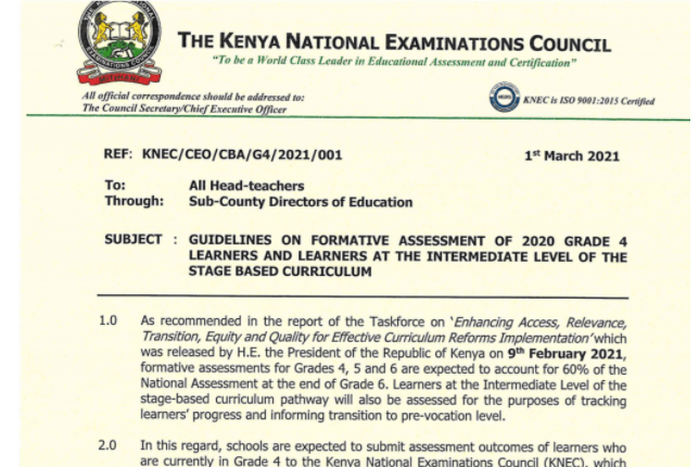 The Kenya National Examinations Council (KNEC) has issued a circular on the subject guidelines on formative assessment of 2020 grade 4 learners and learners at the intermediate level of the stage-based curriculum.