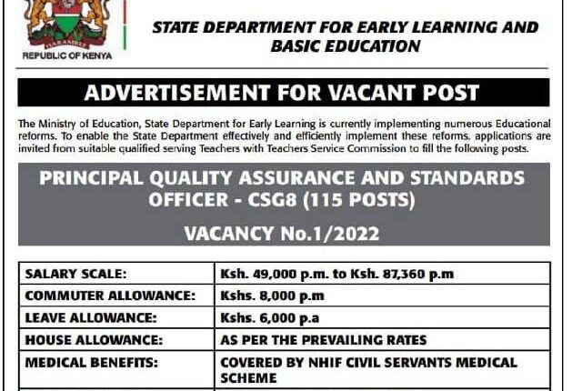 The Ministry of Education has announced the availability of 115 vacancies of Principal Quality Assurance and Standards Officer.