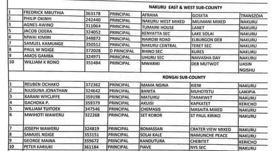 Nakuru County List of School Headteachers Delocalised in 2019/2020