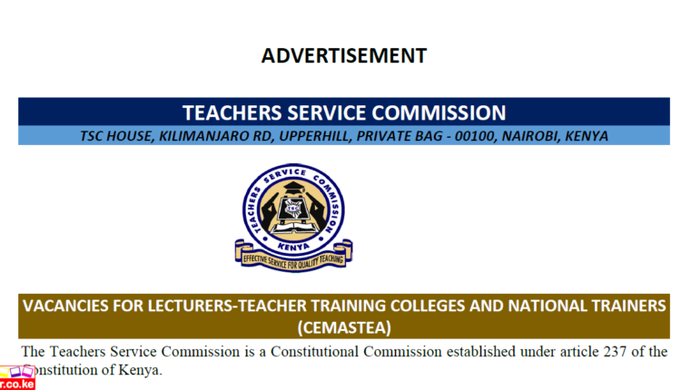 Below is the Teachers Service Commission (TSC) has released an advert containing all the details on vacancies for lecturers-Teacher Training Colleges and National Trainers (CEMASTEA).
